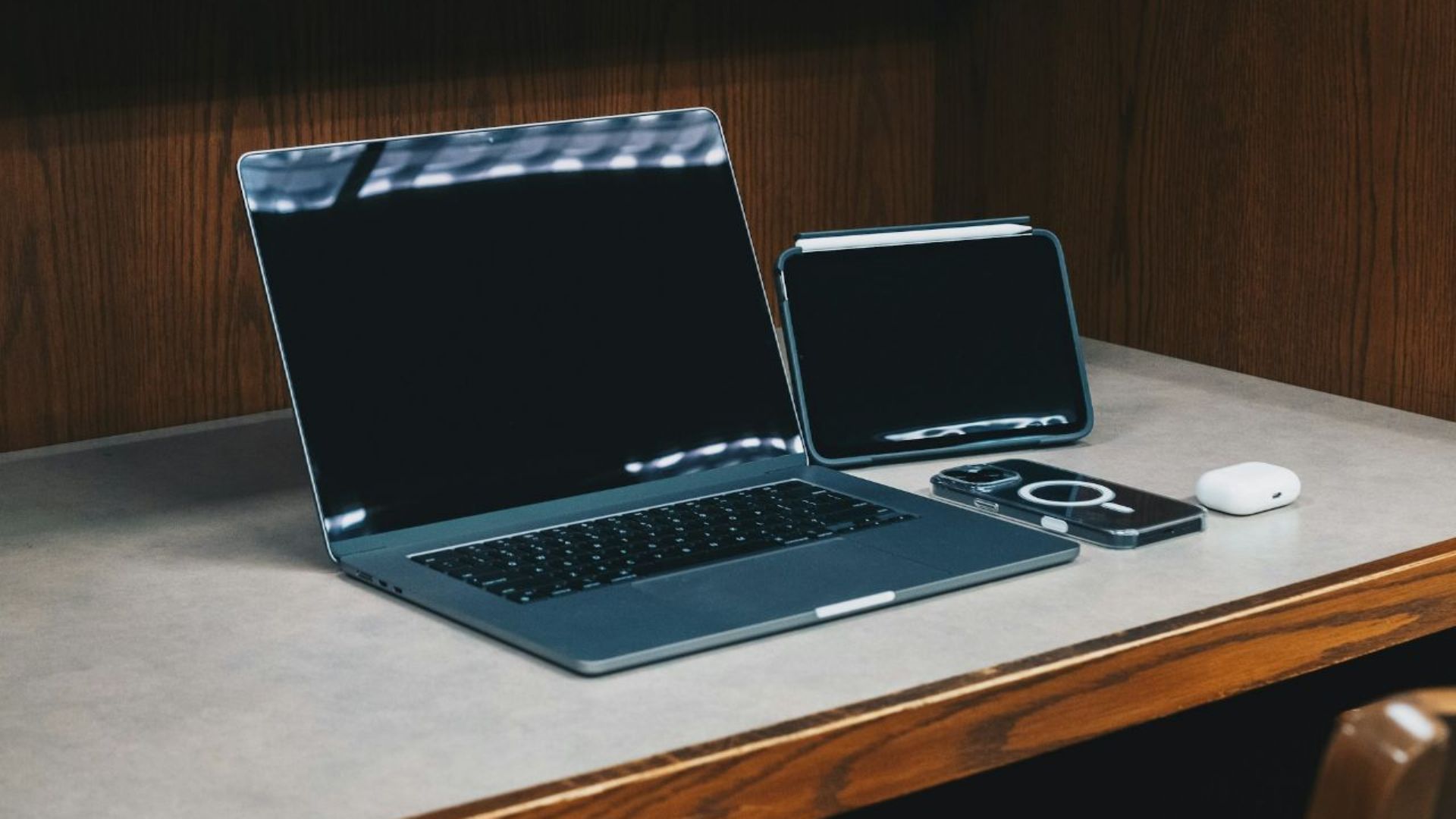 Op de afbeelding zie je een laptop, een smartphone en een tablet. Dit zijn voorbeelden van moderne computers. Ze zijn klein, en veel mensen dragen ze altijd bij zich.